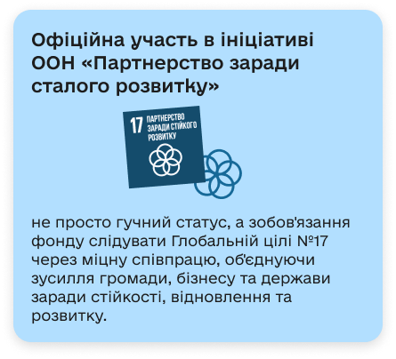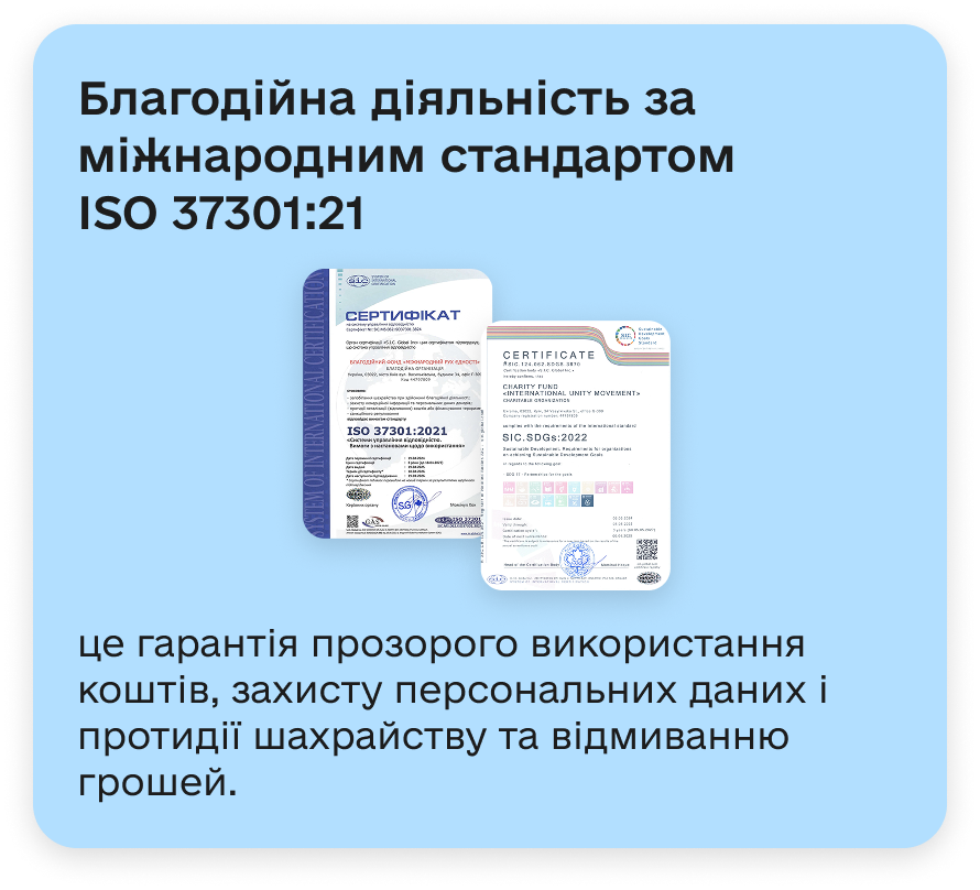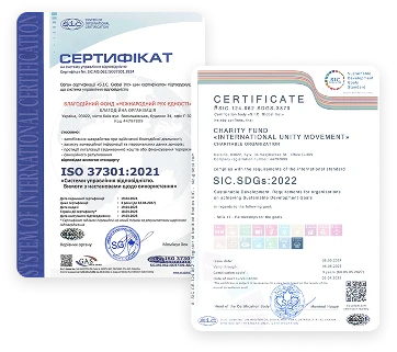 Благодійна діяльність організації відповідає міжнародним стандартам ISO 37301:21 і SIC.SDGs:22, що свідчить про найвищий рівень надійності, прозорості й етики. Захист персональних даних, протидія шахрайству та сталий розвиток через партнерство — це не просто переваги, а обов’язки фонду перед благодійною спільнотою, закріплені в міжнародних документах.