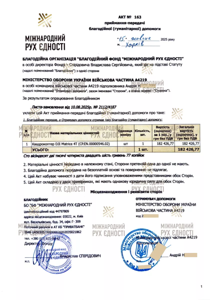 02.10.2025 13:24 | Charitable Foundation «International Unity Movement» | Приватбанк | 5 000.00 |