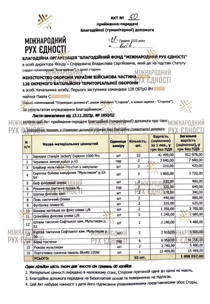 Бійці 128 ОБТрО звернулися до БЛАГОДІЙНОГО ФОНДУ «МІЖНАРОДНИЙ РУХ ЄДНОСТІ» з проханням про допомогу для здійснення закупівель необхідного обладнання та екіпіровки. Вони потребують квадрокоптерів, акумуляторів до квадрокоптерів, зарядних станцій, військової форми, термобілизни, шапок, рукавичок, футболок, рюкзаків та іншого необхідного обладнання для виконання своїх обов’язків.